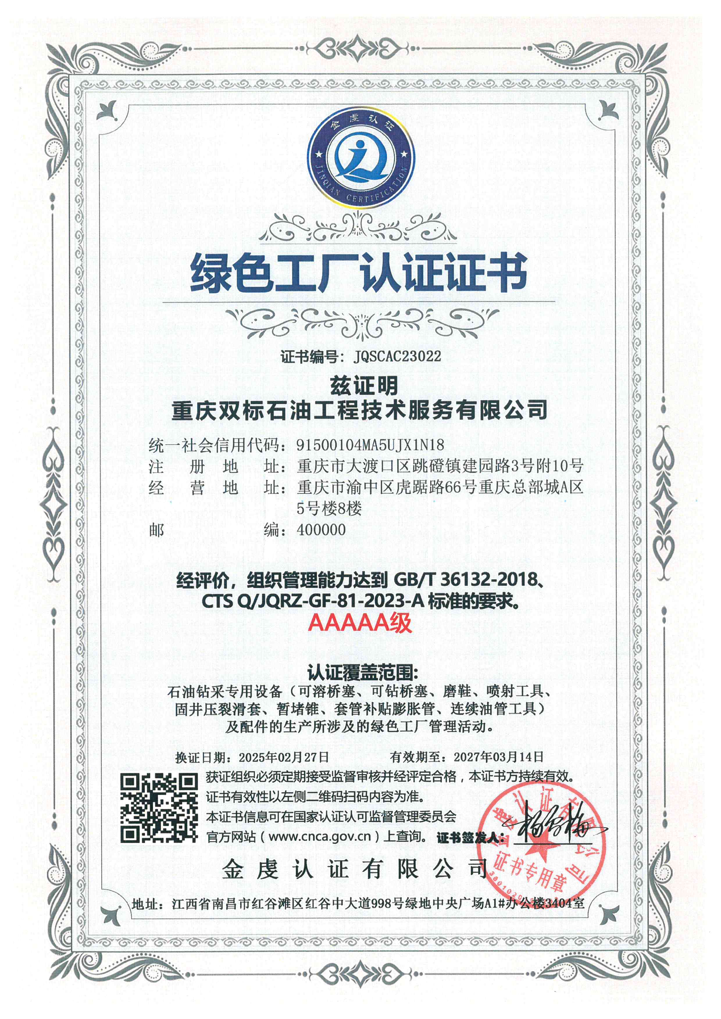 In January 2024, the production and registered address of Shuangbiao Petroleum will be relocated to No. 3-10 Jianyuan Road, Tiaodeng Town, Dadukou District, Chongqing (Building 7-1 of Jianqiao Advanced Manufacturing Industrial Park)